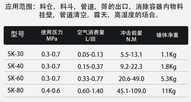 本产品主要特征有:磁力冲击大、落粉效果好;耗气量少,运行成本低,节能效果好;结构简单、拆卸方便;外观设计新颖、别致,活塞耐冲击,且能防爆,广泛适用于农药、医药、涂料、染料、颜料、食品、电子、建材、矿产、干燥、仓储等行业,是粉体加工生产线有力的破拱助流装置。